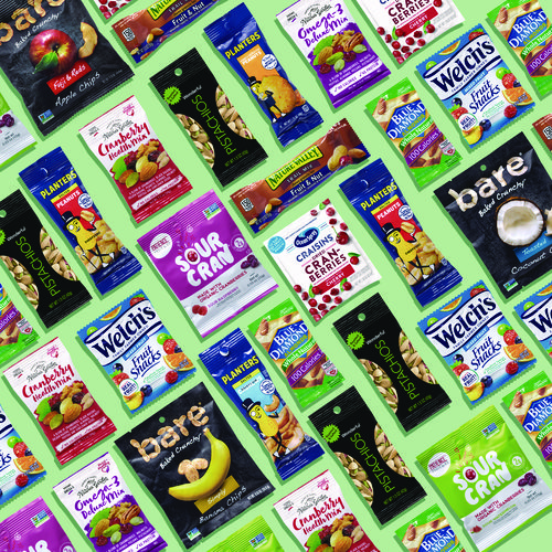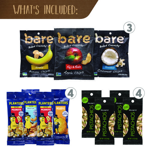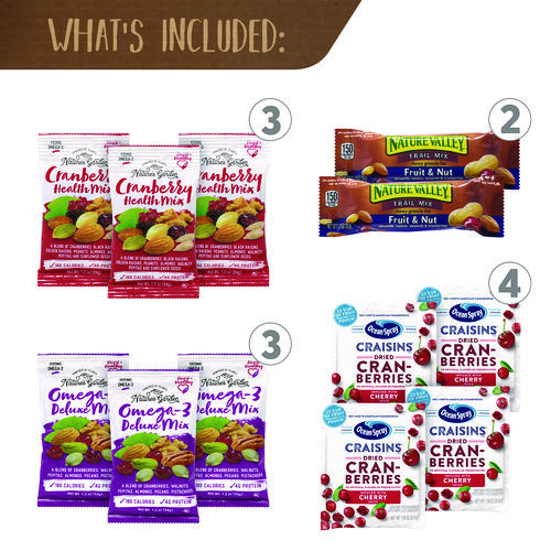 - Box includes Welch's Fruit Snacks, Ocean Spray Craisins, Planters Peanuts & Cashews, Blue Diamond Almonds, Wonderful Pistachios, Bare Chips Variety, Paradise Valley Mega Omega Mix & Almond Cran Crunch Mix, Nature Valley Fruit & Nut bars, Sour Cran Sour Watermelon and Sour Cran Sour Raspberry.